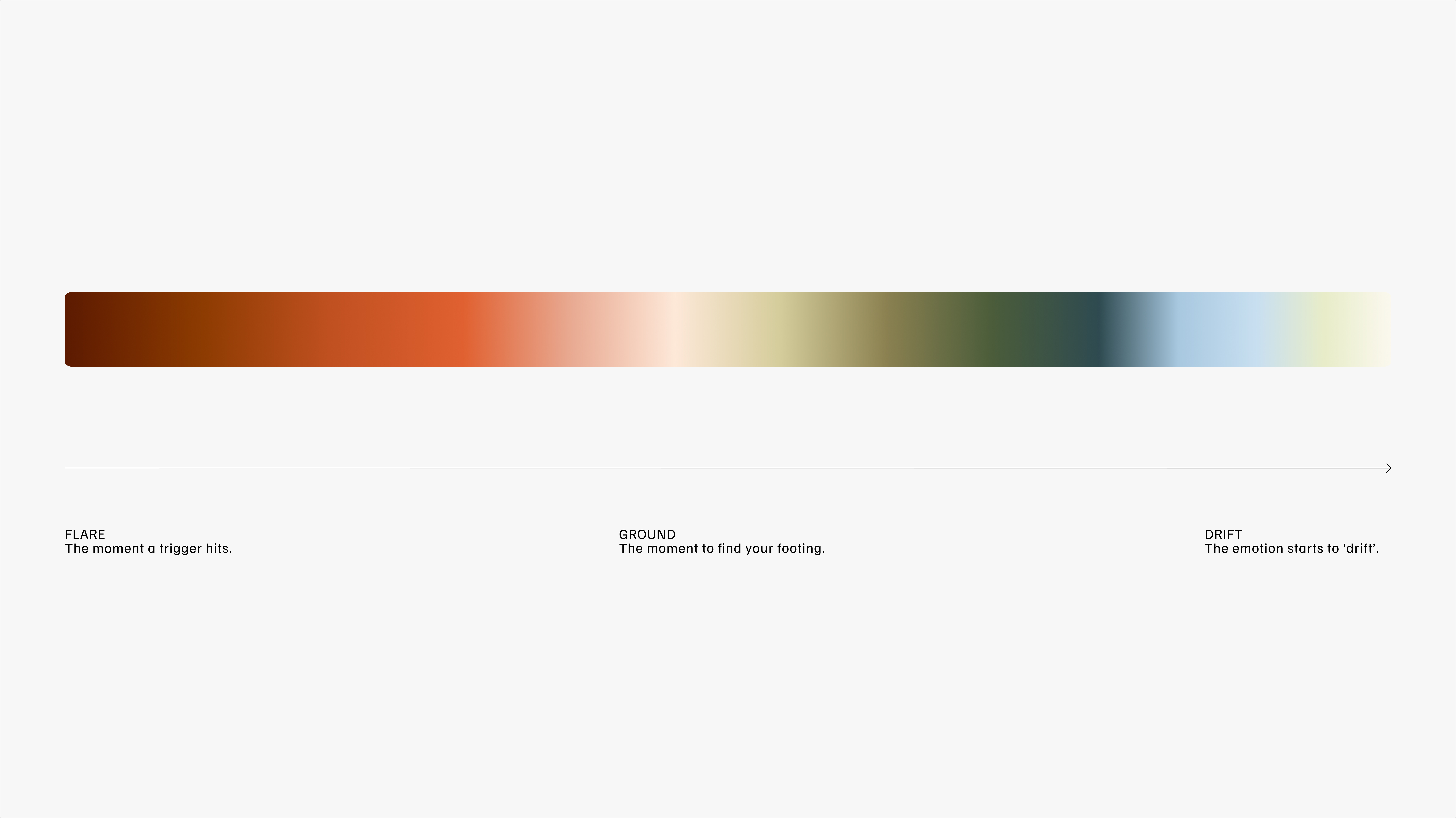 Firebreak colours function as an emotional expression. More than an aesthetic choice, the Firebreak colour palette is a visual tool for capturing the emotional timeline, from heated, to the in-between, to a more neutral state. Taken from the literal idea of breaking fire with water and earth elements, and expanded into a direct relation to emotional states. As those transitions happen, colour becomes a subtle visual language for marking where you are.